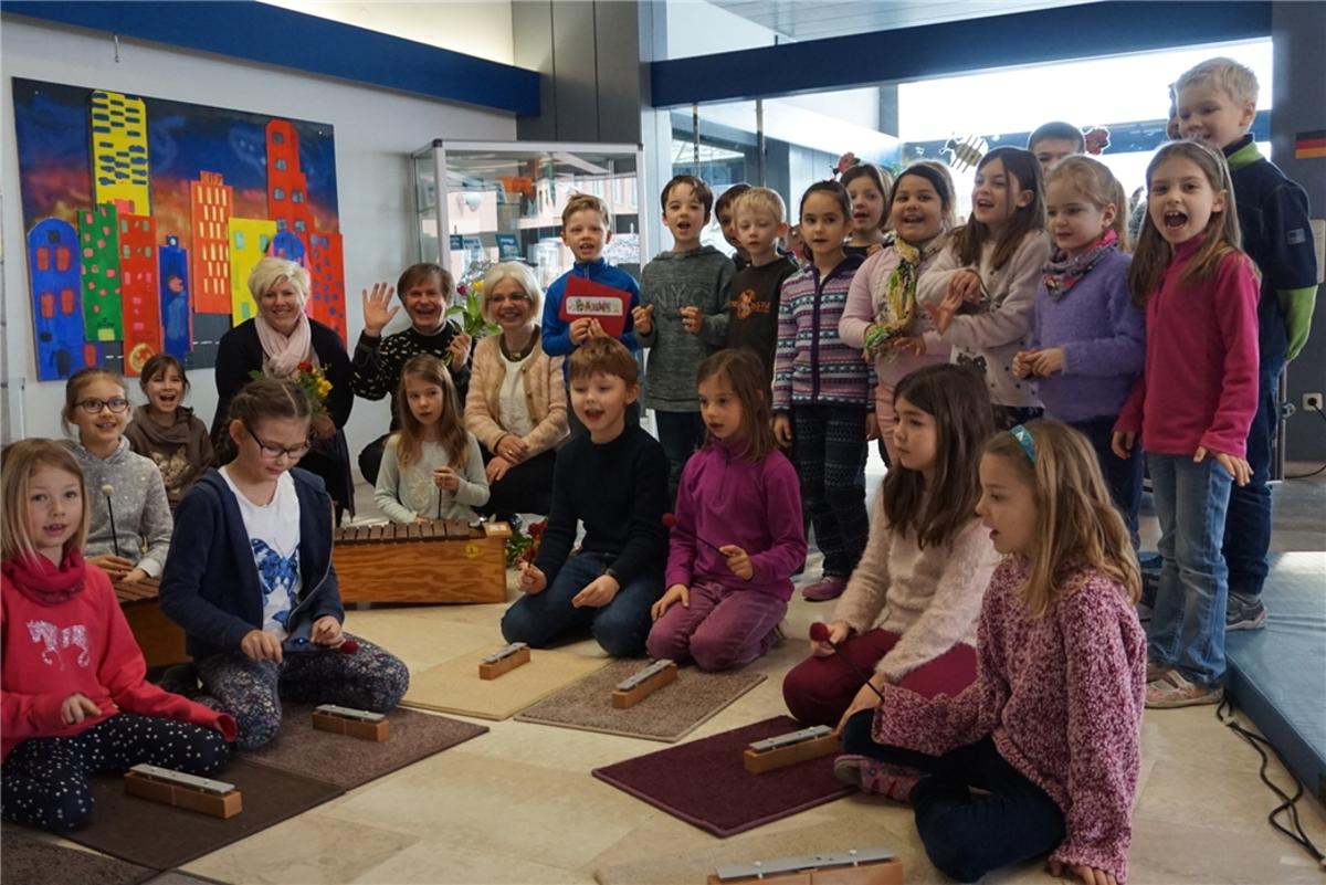 Im Oktober 2017 fand ein Benefizkonzert zugunsten der Musikförderung an Grundschulen statt. Die Kinder der Grundschule Rosenheim-Pang erwartete deshalb gestern Vormittag eine besondere Überraschung. Die stellvertretende Vorsitzende Annette Kopf und der künstlerische Leiter Thomas J. Mandl der Innphilharmonie Rosenheim überreichten den Schülern Metallofon-Klangbausteine aus dem Orff-Instrumentarium. „Jetzt können viele Kinder gleichzeitig das gemeinsame Schullied begleiten, getreu dem Jahresthema: Der gute Ton schwingt weiter“, freute sich die Lehrerin Elisabeth Langer. Ebenfalls im Bild zu sehen ist Alexandra Linordner (hinten links) vom Förderverein der Grundschule Pang.